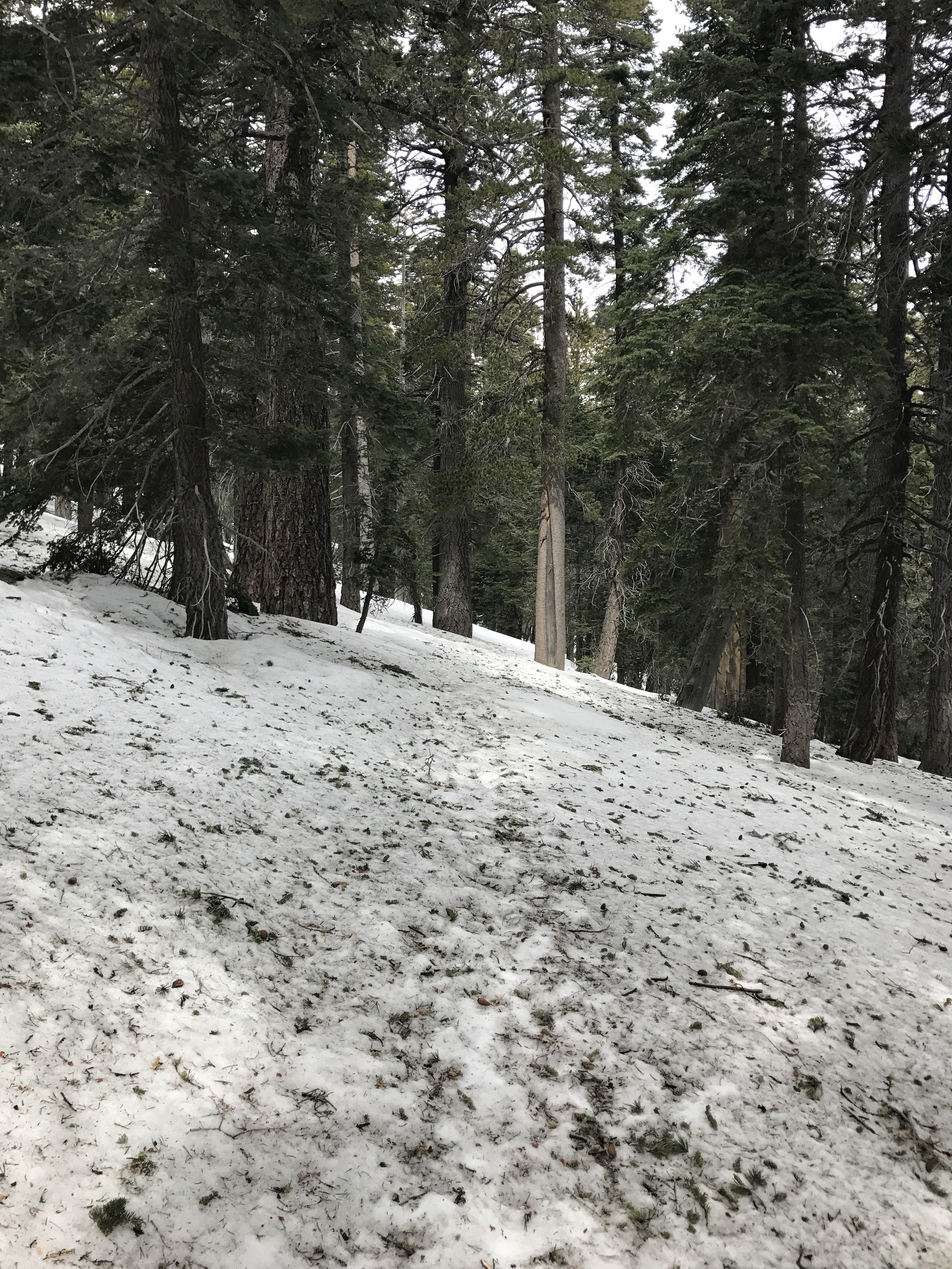 I started hiking on the Fuller Ridge Trail at 2pm.  The trail is a 5 mile ridge top traverse starting at 9,000 feet and dropping to 8,000.  The trail is known for its steep sides and for snow accumulation.  The snow right now is hard crusted, but has some footprints that provide both a direction and a foothold.  I wear microspikes attached to my shoes to get better traction on those footholds