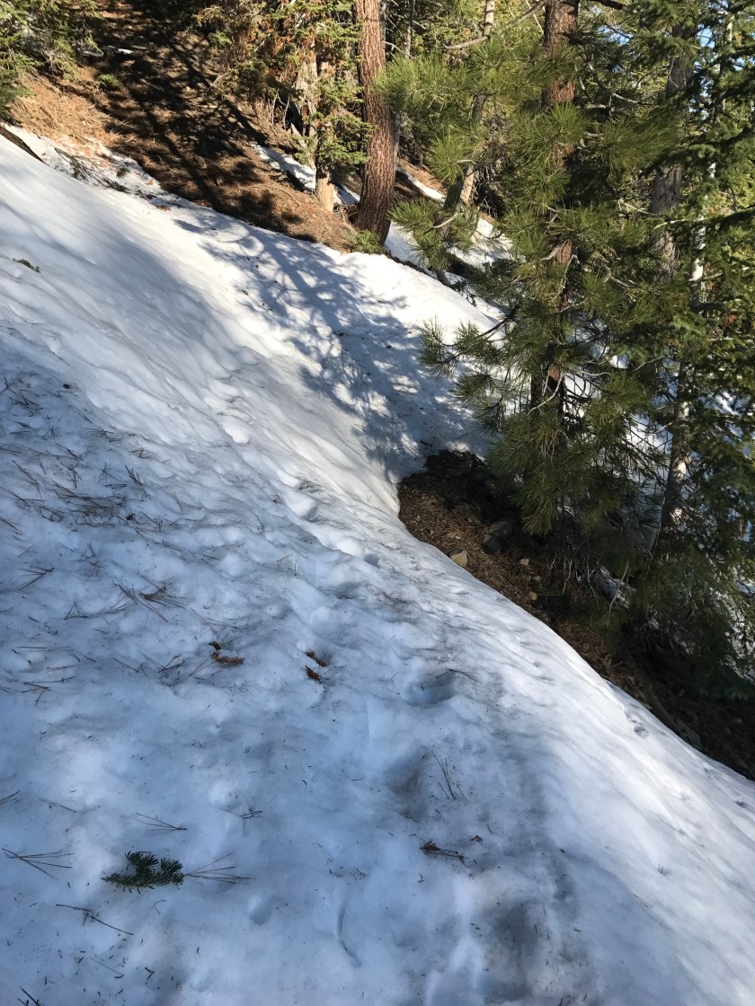 I also have a pair of larger shoes — my feet have either swollen or flattened to the extent that my normal sized shoes are too small. This is common and long distance hikers point this out often, but it has not happened to me on the last two long trips I did. My toes started feeling cramps the day I left Big Bear and today I was hiking with the laces as loose as possible. Maybe that’s also why I slipped in the snow…