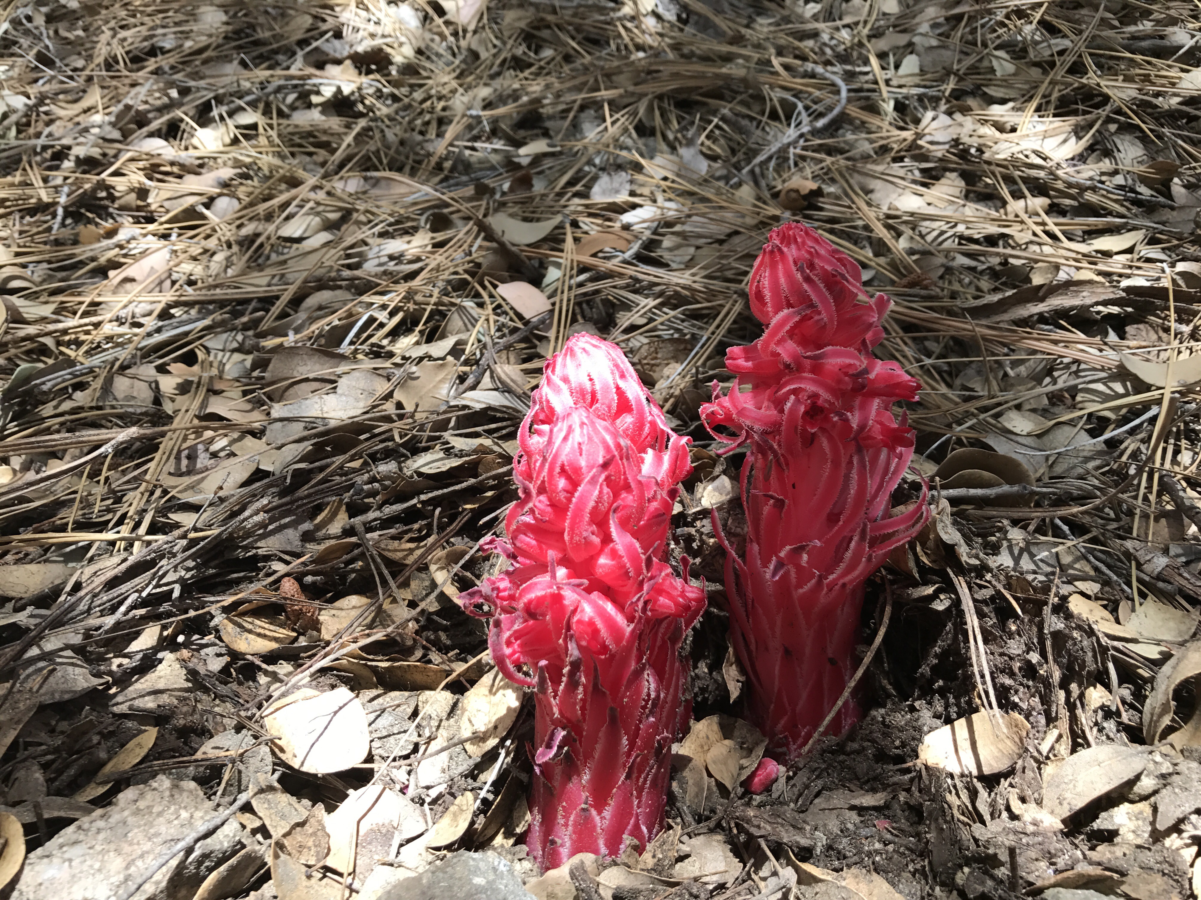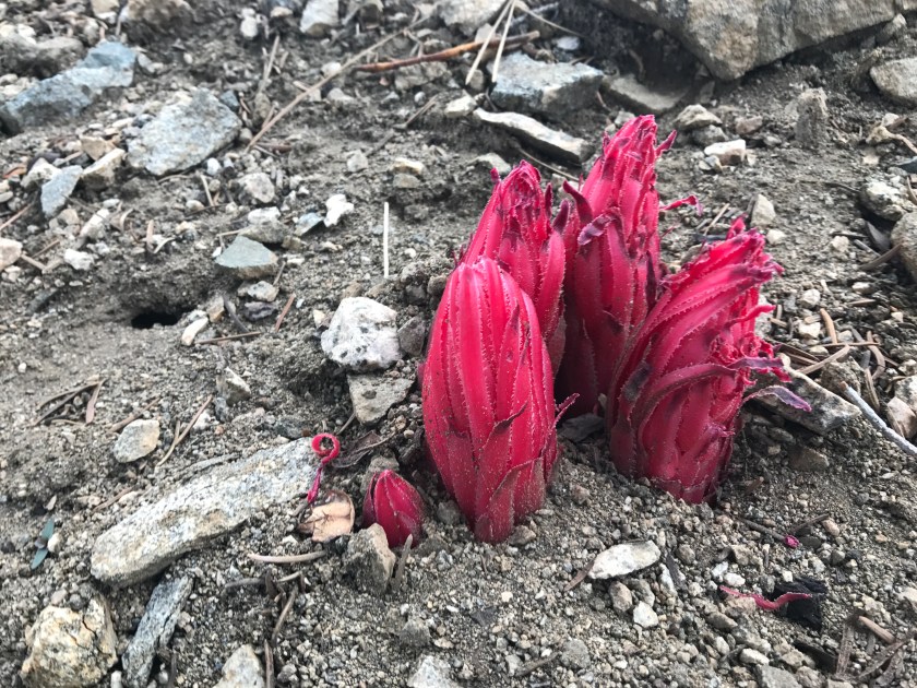 I also saw the first of four Snow Plant sightings. These pop up early in the season, sometimes popping out of residual snow, hence the name. They grow to about 9″ tall and then sprout little round flowers.