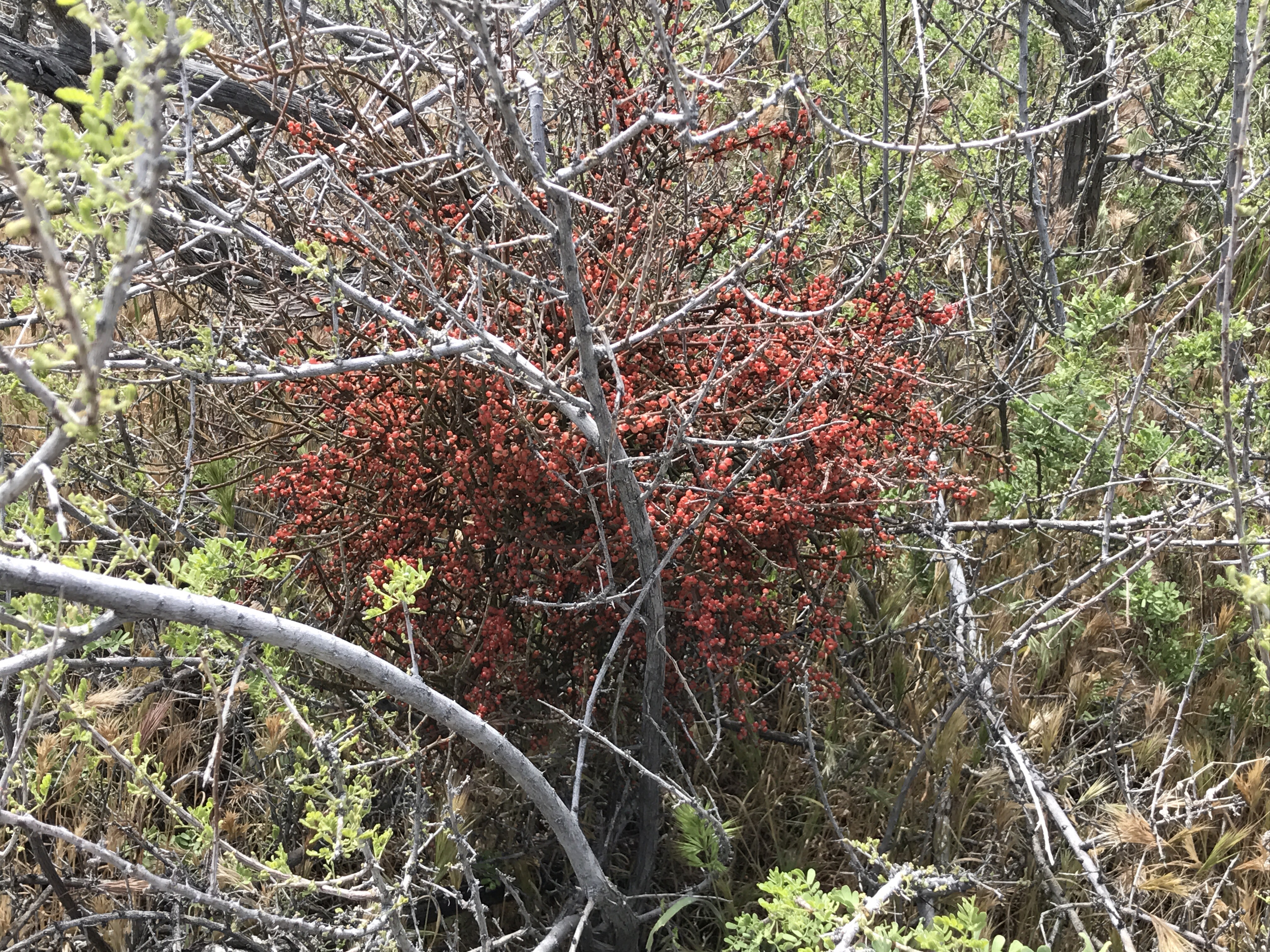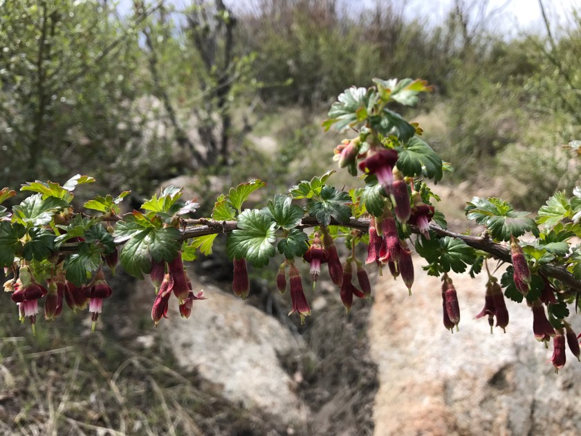 Also I came upon Gooseberry in bloom — later in the summer these bushes will be covered in edible spiny red berries.  They are a favorite of coyotes and bears.