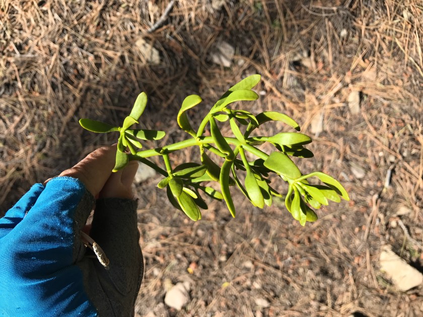 Speaking of mistletoe, I have seen four types of parasitic plants so far on my adventure — the common mistletoe, above, here’s a closer view