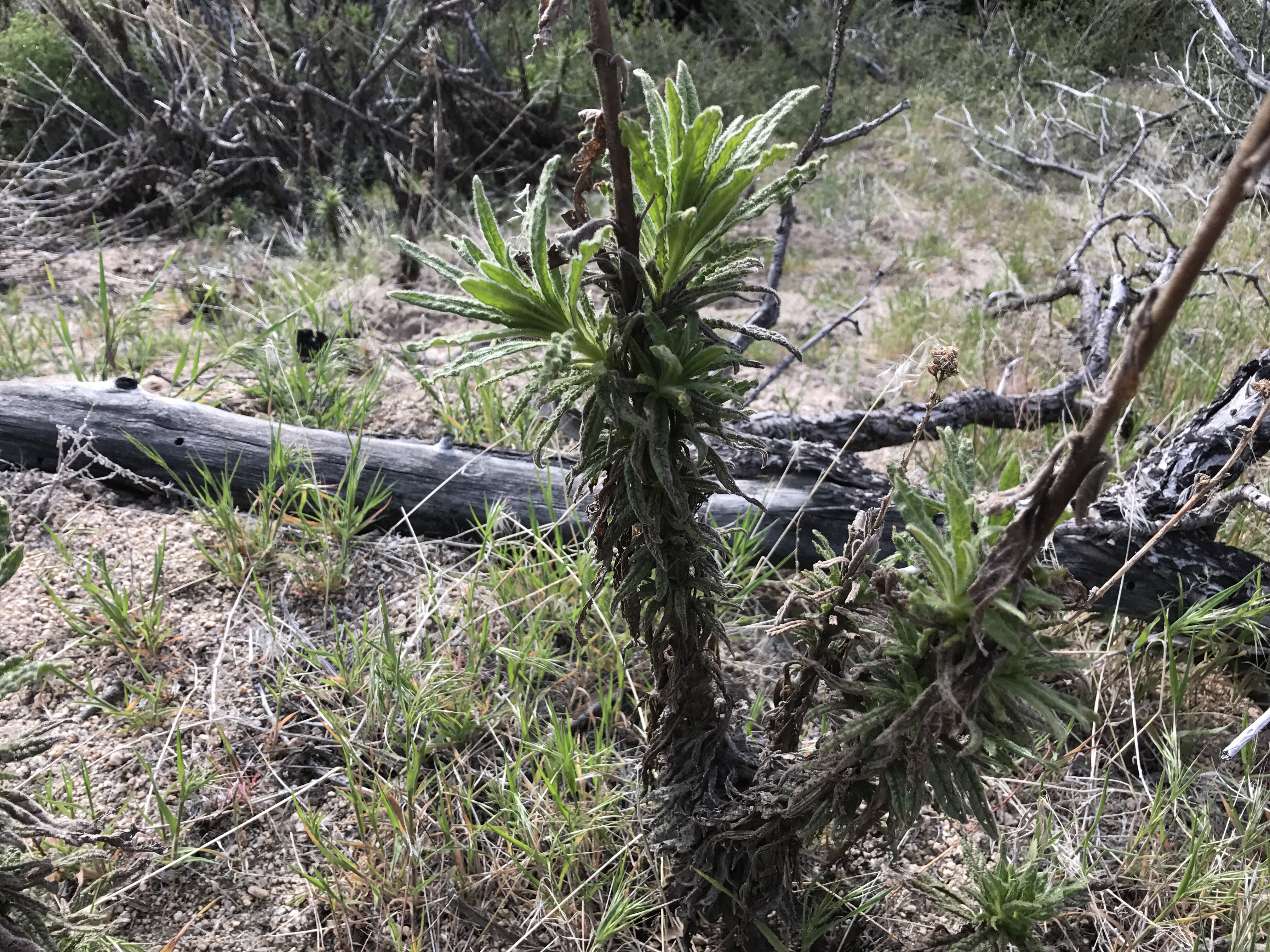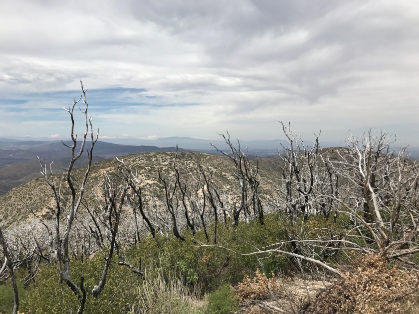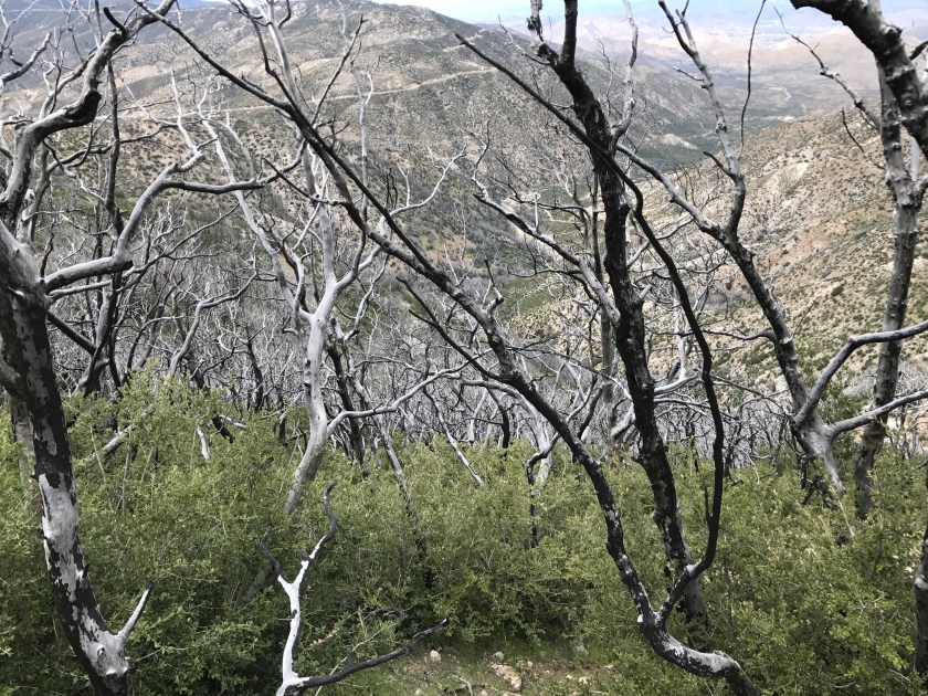 The area I hiked through burned last year but is regrowing fast.  This creates a two-layer look with green below and black/white above