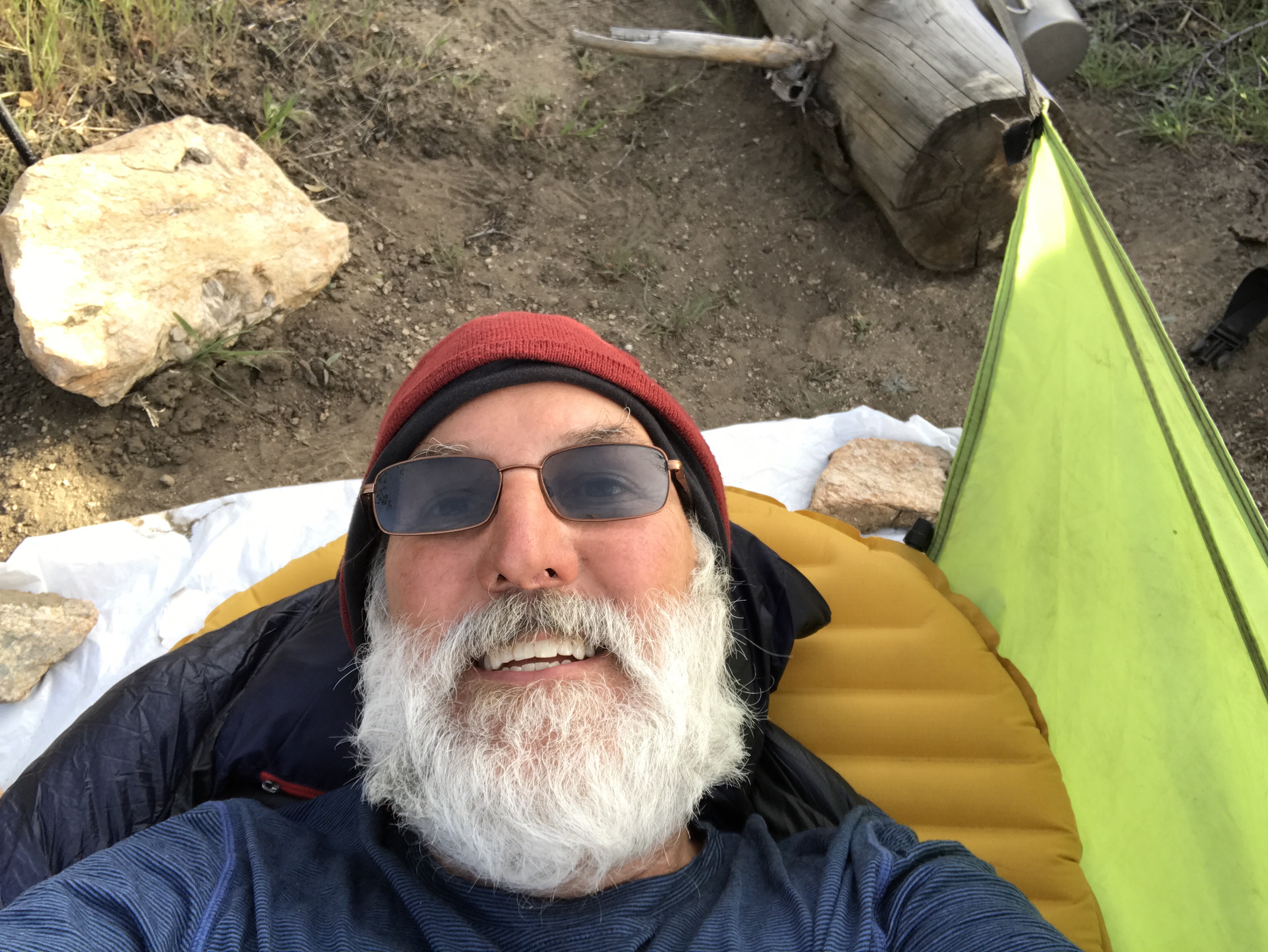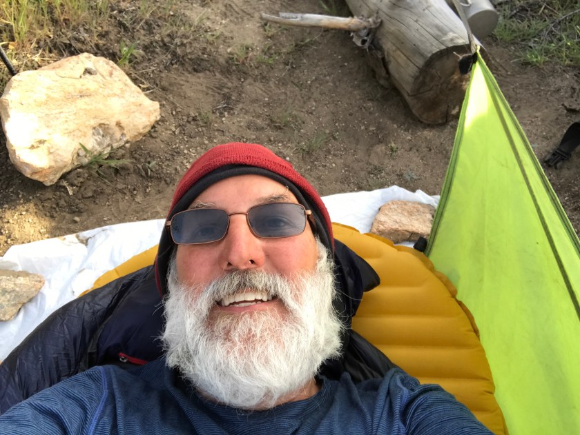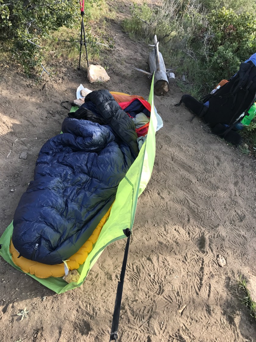 I arrived at my intended campsite at about 3pm, so I decided to hike up the next ridge.  At about 5pm I started looking for a campsite – the problem was that the trail traversed a long ridgeline with very few flat spots.  At last, and just before the sun was about to set I found a good site, but it was too small to set my tent up on.  Someone had lost the green rainfly for their tent, so I decided to improvise a combo groundcloth and windbreak so I could cowboy camp.  I tied two ends to branches on nearby stumps.