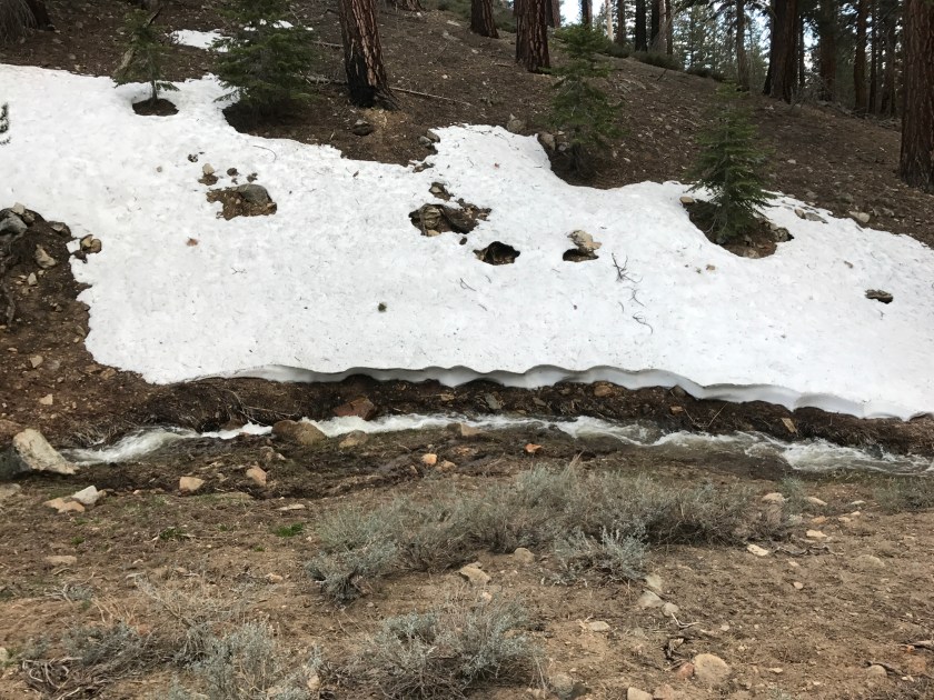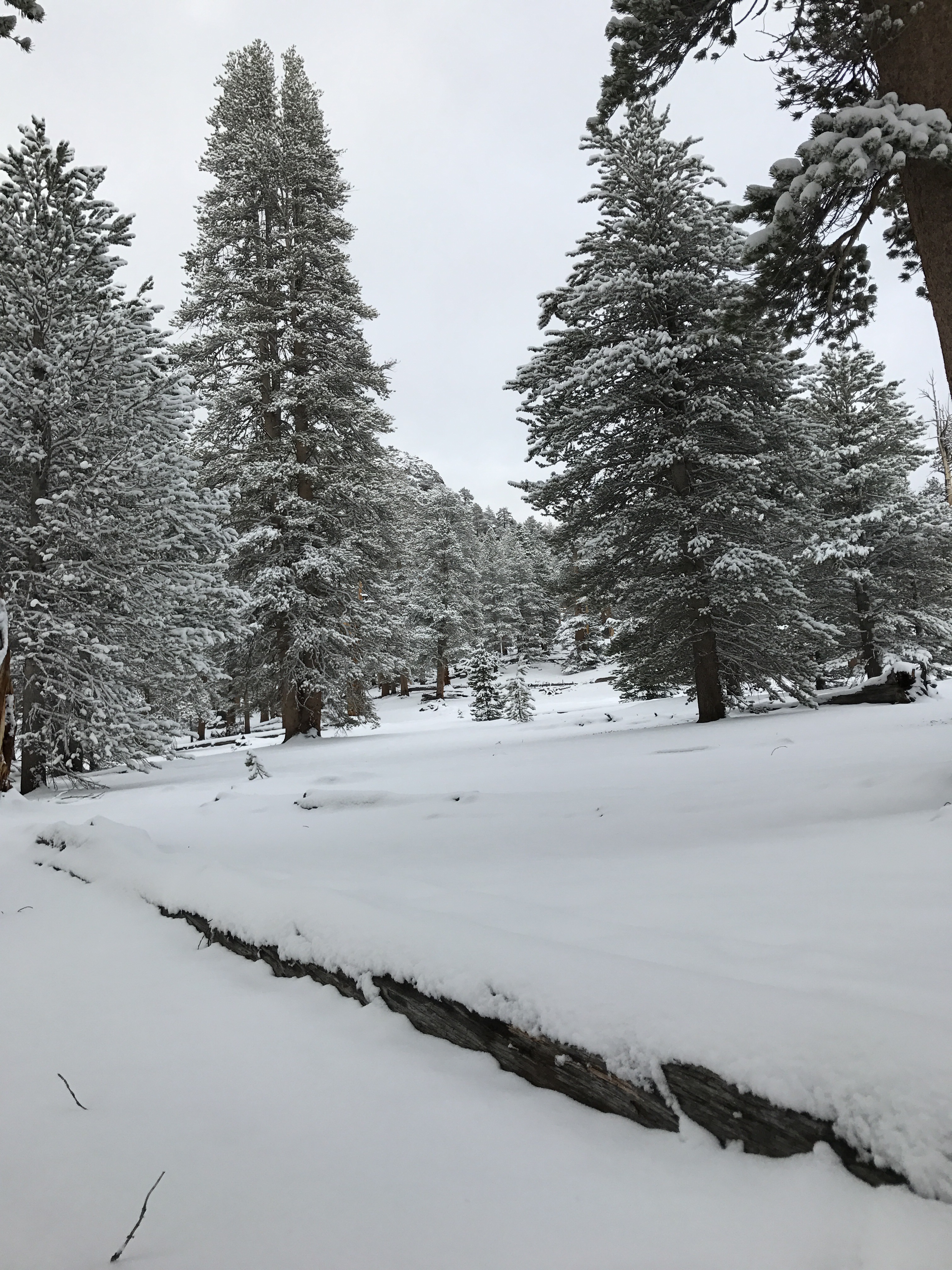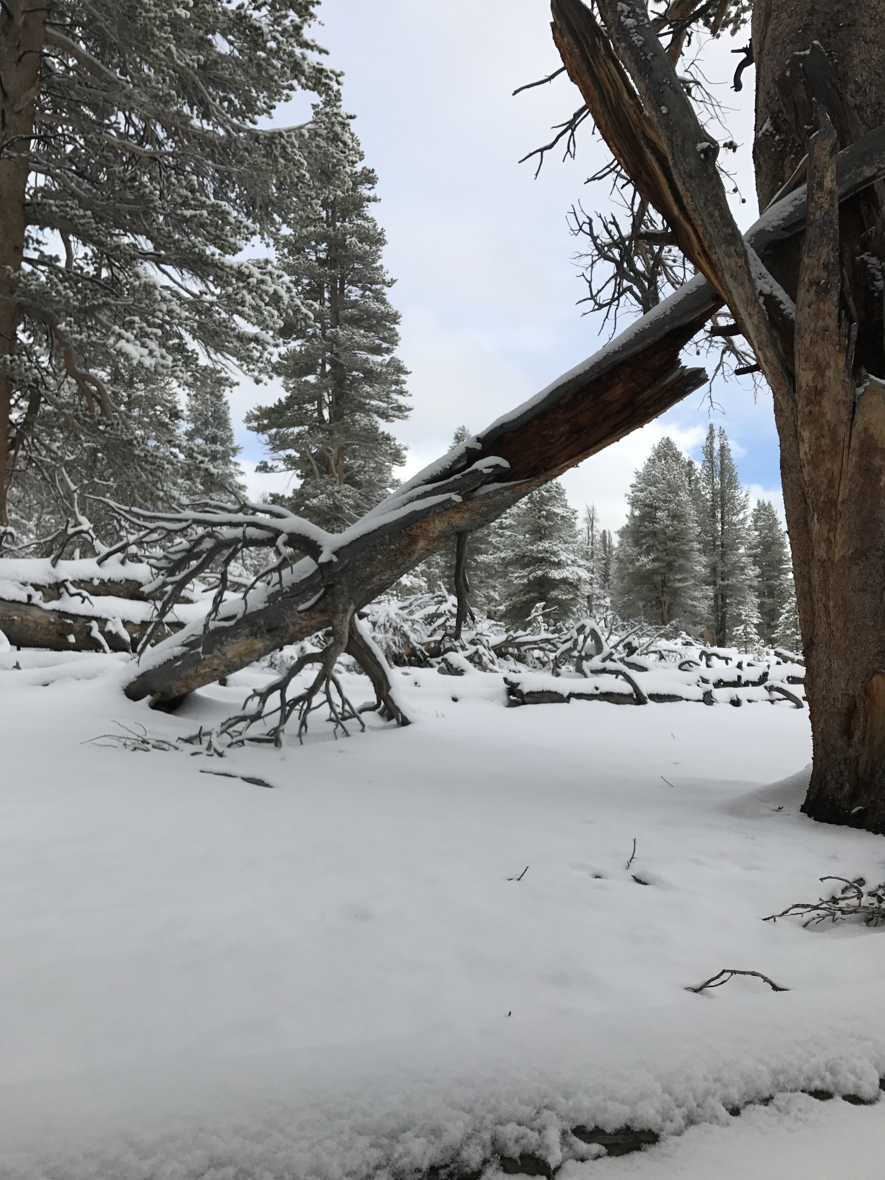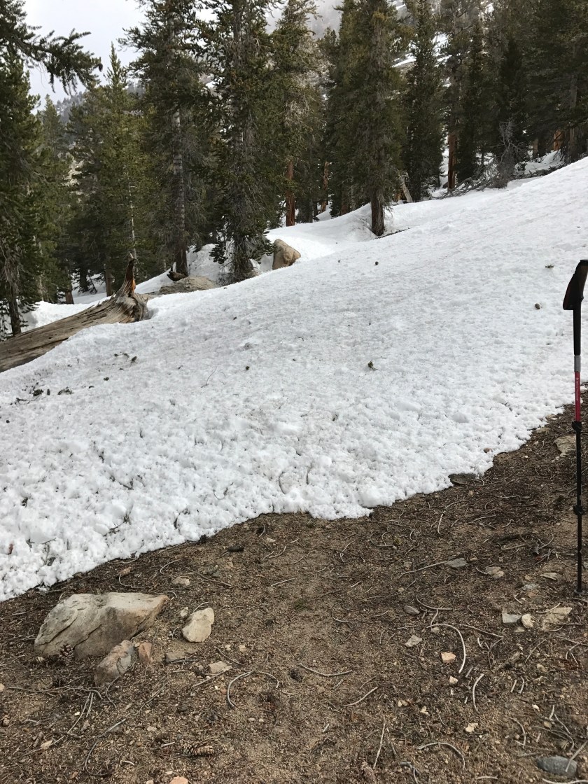 I obtained another weather report and confirmed that the snowstorm should abate overnight. I received texts from my wife Liz, with input from Steve Schaniel, suggesting alternate exit options out of the Sierras should I need them. I have maps and GPS waypoints to get me to Trail Pass/Cottonwood Pass, 14 miles to the north, or 25 miles back to Kennedy Meadows to the south. The alternate exits are back the way I came and then East over trails that are buried in snow. I saw no trace of them as I walked to here. Going back also means going to higher elevation. I decided to wait for the morning’s weather report…