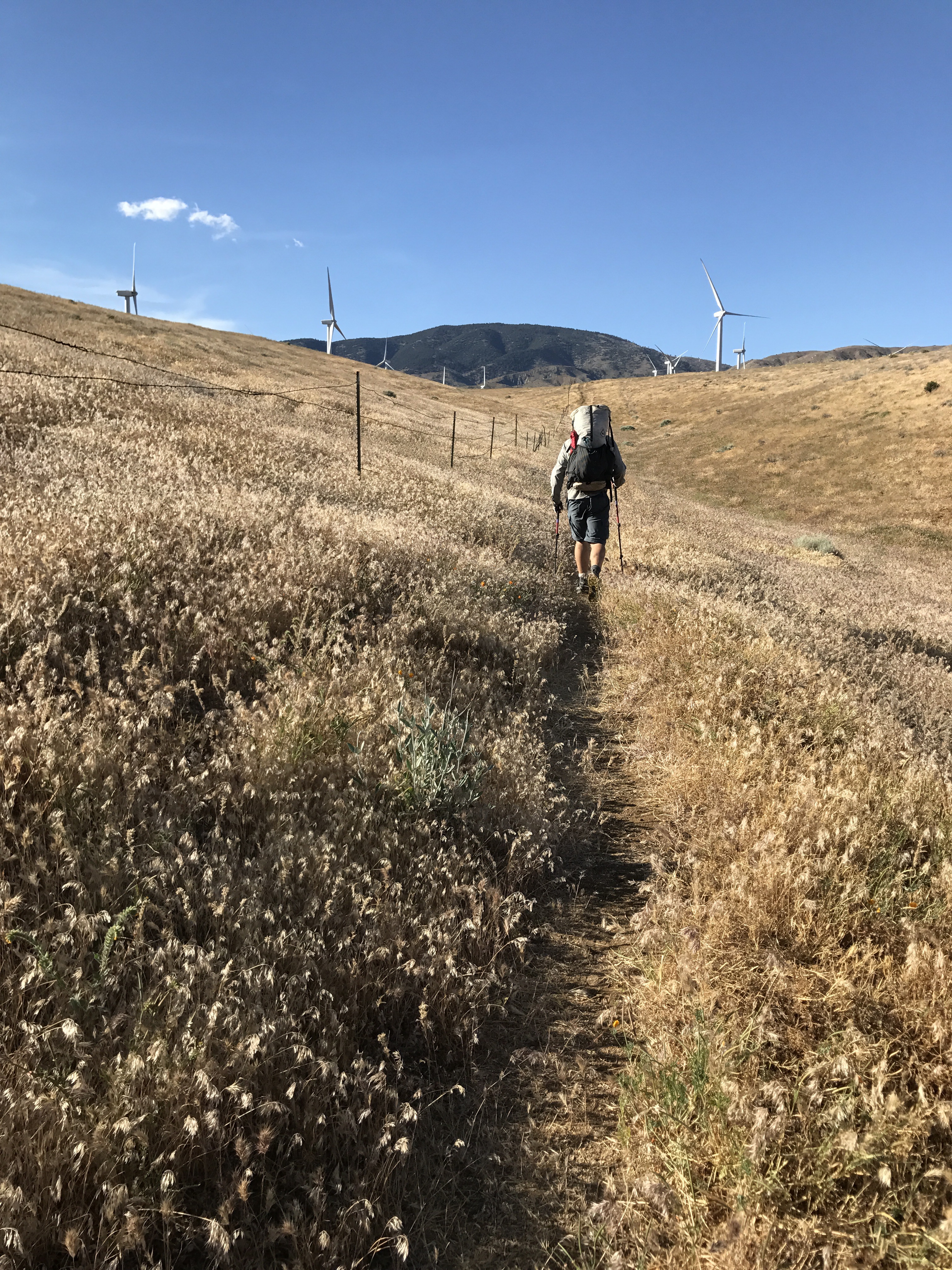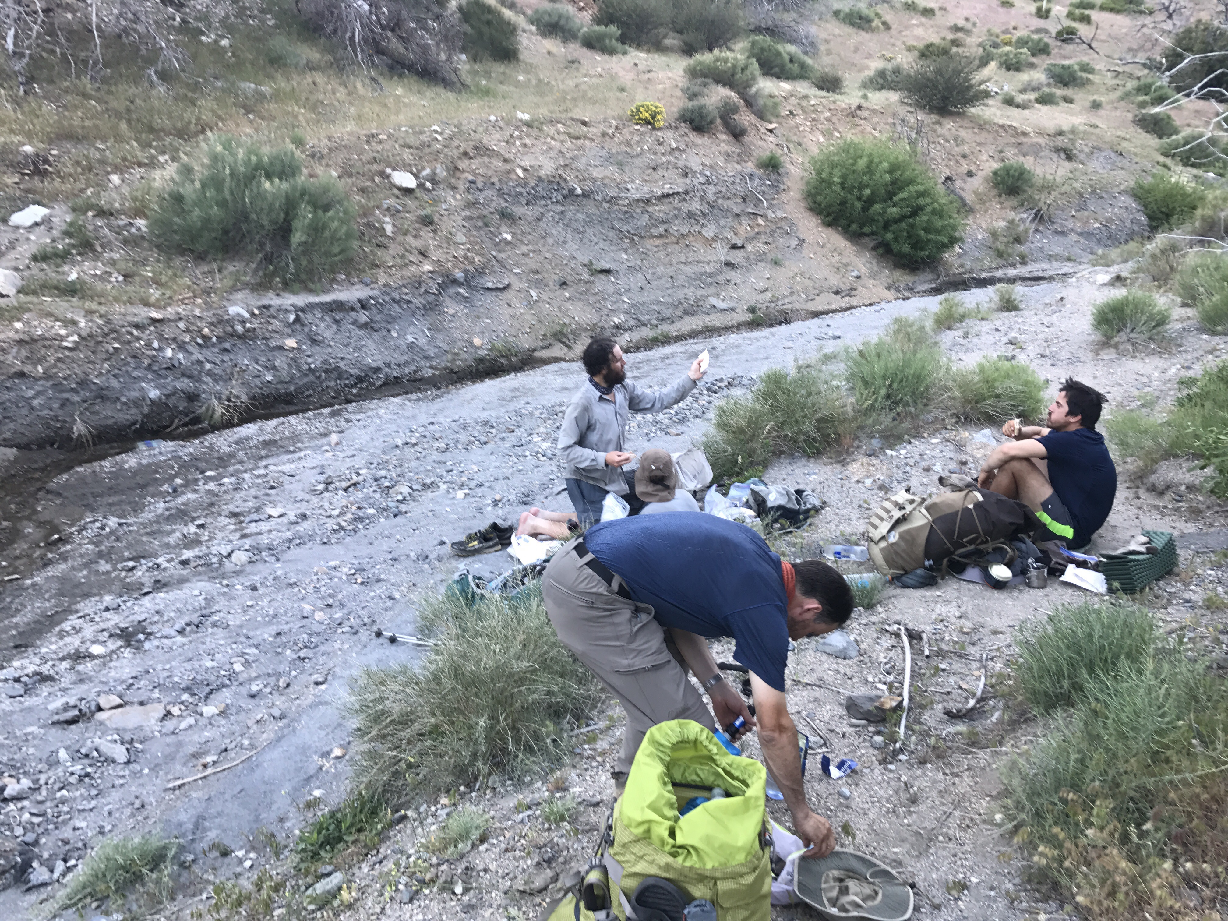 Up through the Wind Turbine farm and over a few ridge-lets, we arrived at our first, and possibly only remote water source: a creek in a deep canyon. Double prizes: water and shade!