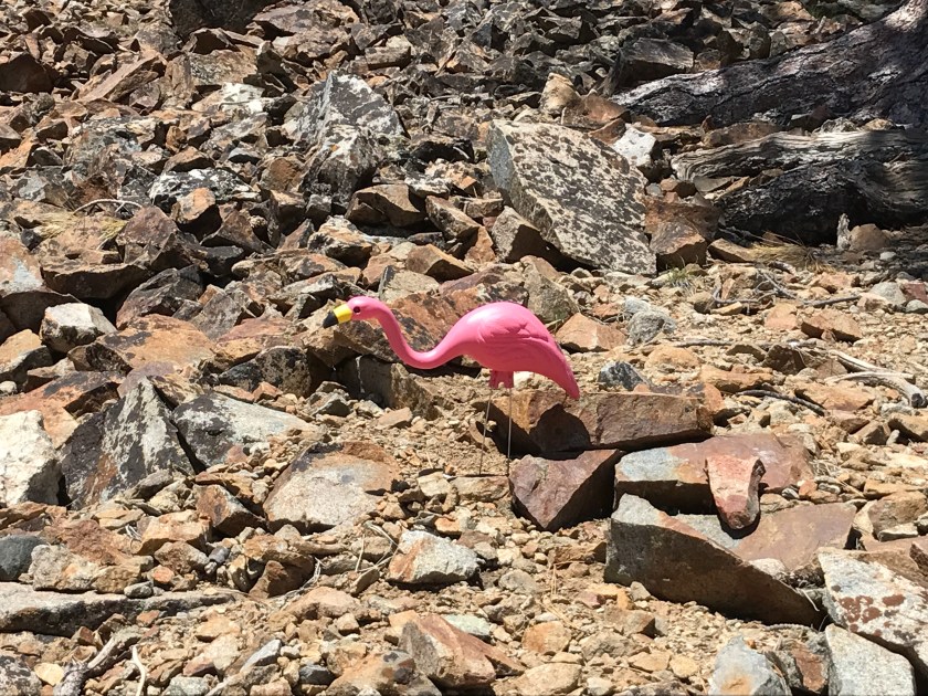 We also encountered a very rare sight just off the trail and up a ways: a Sierra Flamingo in full mating plumage.