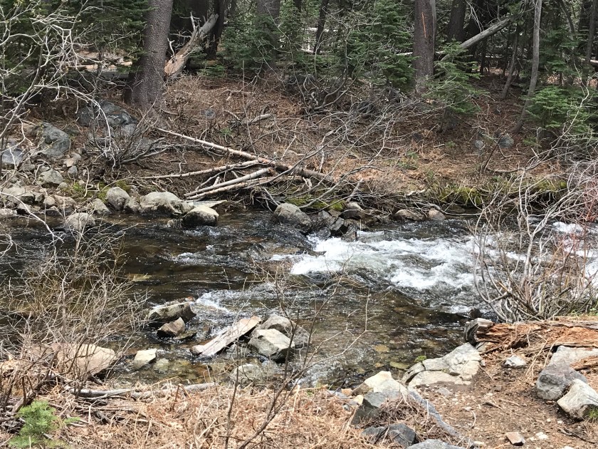 Upstream it was wide and deep heading into a meadow and I could not see any logs to cross on. Downstream there was a log jammed up against a boulder that looked pretty good. The log was wet however, and a slip would mean falling into fast moving cold water. I remember the two hikers that drowned solo crossing streams and decided to keep looking. Further downstream there was a couple of large logs and sticks and mud and whatnot forming a bridge so I decided to cross there.
