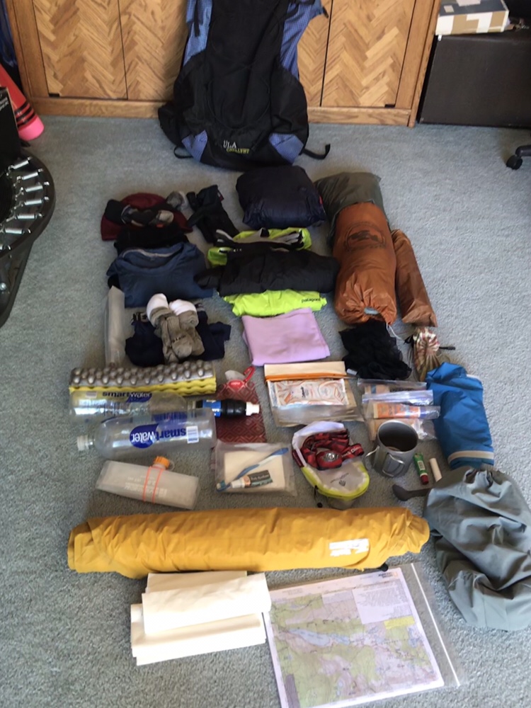 I’ve learned a lot from my previous trips. I have shaved pounds off my my pack weight: I now have a “base weight” (backpack weight without food, water or fuel) of just over 20 pounds. That means for a 5-day stretch with food and water my pack will weigh about 30 pounds. Not bad at all! Here’s my gear (I forgot the sleeping bag in this photo).