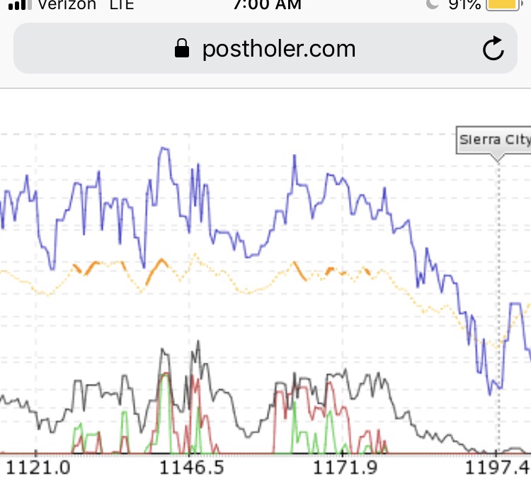 It is complicated, but the orange line tracks the elevation of the PCT and the dark orange parts are where the snow is. The green line is a measurement of the snow depth. Donner Summit is at PCT mile 1157.