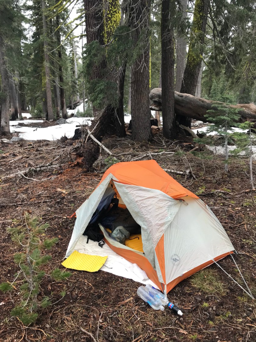 At White Rock Creek, all the established campsites were under snow or were bogs so I had to pitch my tent on non level ground.