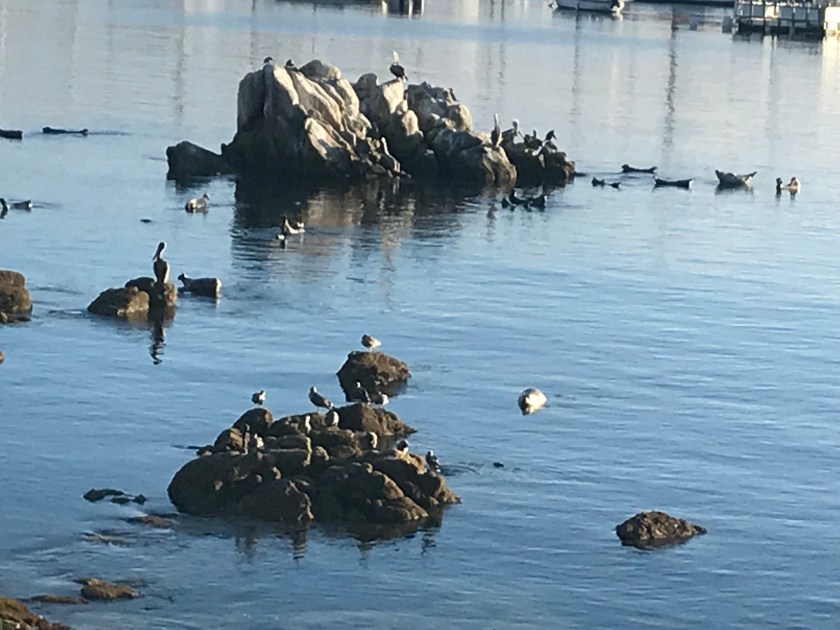 In Monterey harbor I saw the pelicans and seals sharing rocks