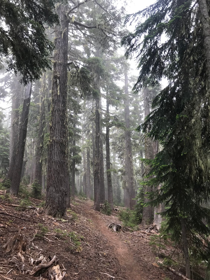 It was still fog-dripping in the morning, but I need to get going. I figured the fog would lift as the morning went on and so ate on the trail. With all the “rain” overnight, there were completely dry spots where there were no trees above.