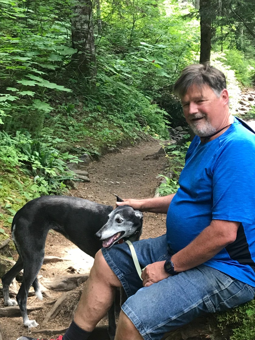 After a nice lunch, I started hiking up the 2,000’ hill to get me to my destination. Mike and his Greyhound, Gaige joined for a bit.