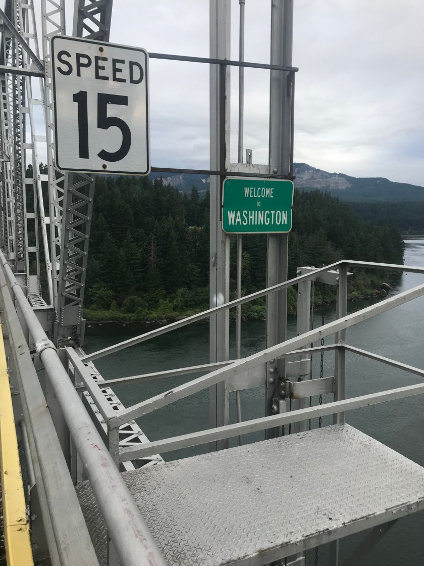 I crossed over the Columbia River into Washington. It was warm and humid with thick clouds, but the weather report showed no rain for the area today. I removed the leggings from my convertible pants to stay as cool as possible— today is a lot of uphill to get out of the river valley.