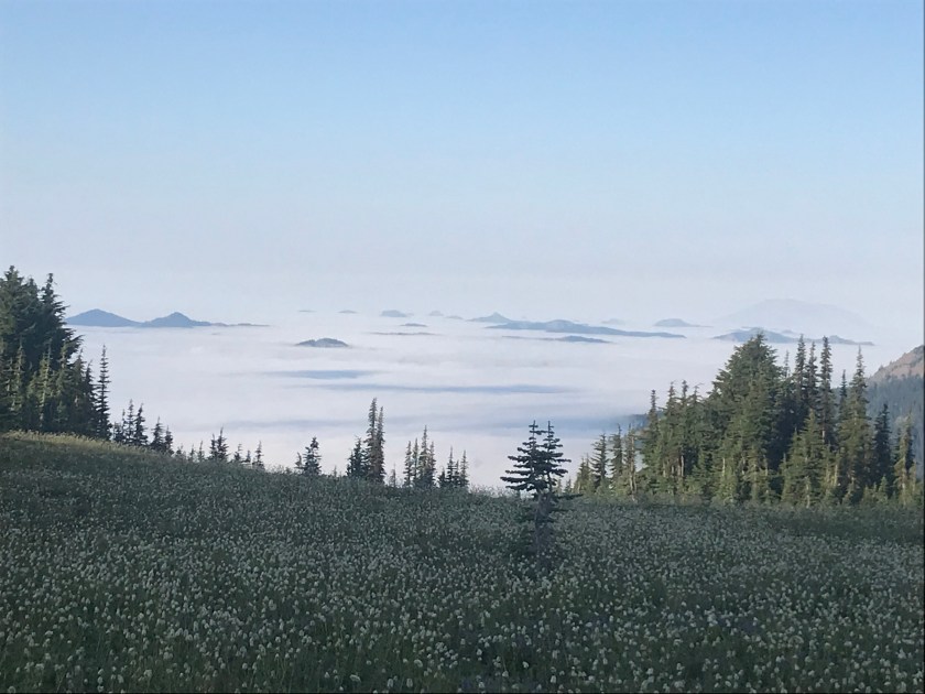 Today I’ll be staying at higher elevations all day, with many great views. I rounded a corner and saw mountain peaks poking out of a sea of clouds.